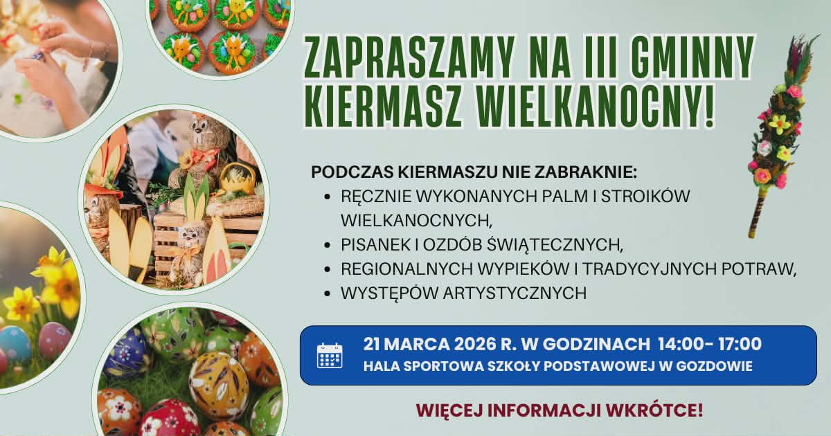 III Gminny Kiermasz Wielkanocny 21 marzec 2026r. w godz. 14:00 – 17:00 Hala Sportowa Szkoły w Gozdowie