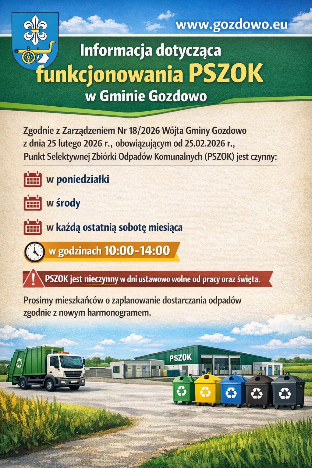 Zgodnie z Zarządzeniem Nr 18/2026 Wójta Gminy Gozdowo z dnia 25 lutego 2026 r., obowiązującym od 25 lutego 2026 r., Punkt Selektywnej Zbiórki Odpadów Komunalnych (PSZOK) jest czynny: