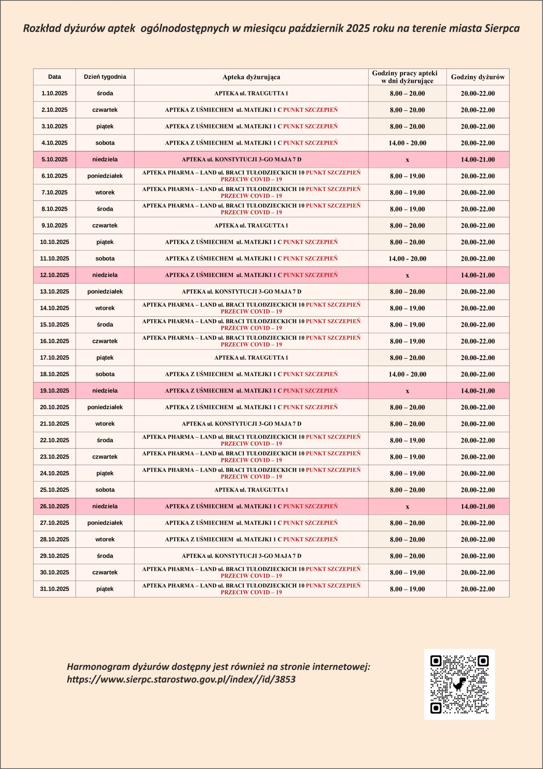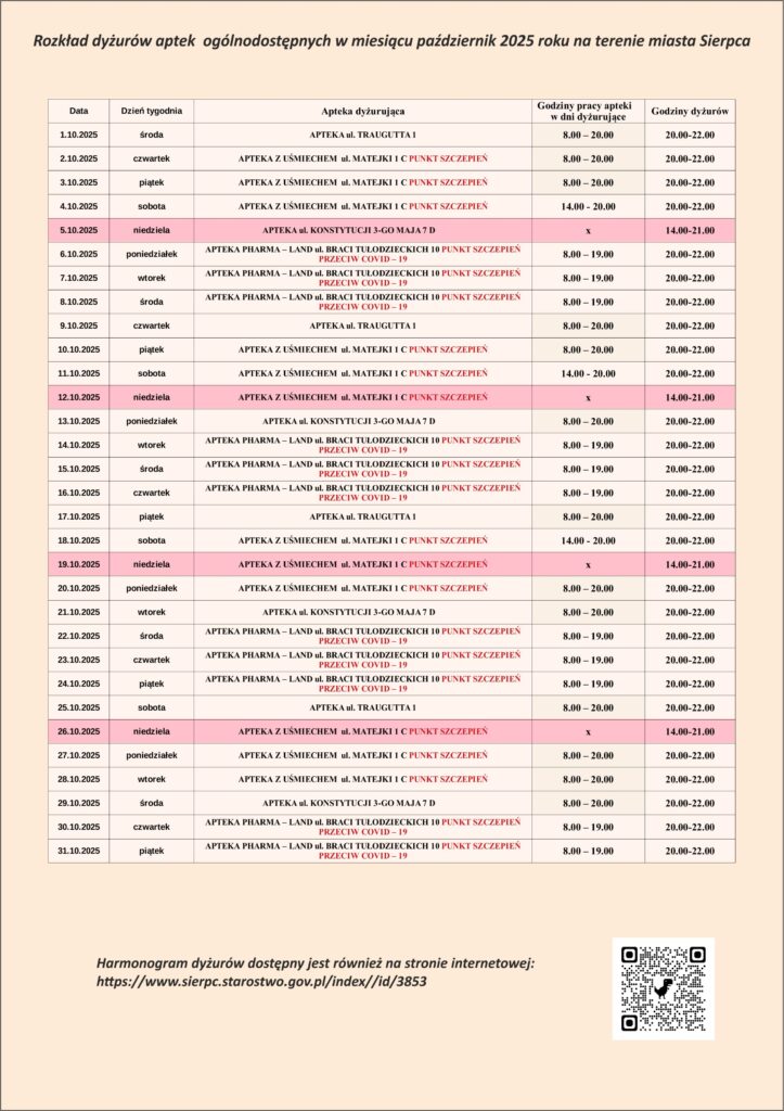 Rozkład dyżurów aptek ogólnodostępnych w miesiącu październik 2025 roku na terenie miasta Sierpca