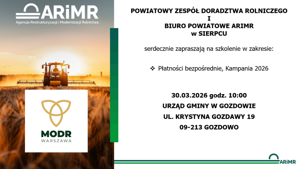 Powiatowy Zespół Doradztwa Rolniczego i Biuro Powiatowe ARIMR w Sierpcu serdecznie zapraszają na szkolenie w zakresie: Płatności bezpośrednie, Kampania 2026 w dniu 30.03.2026 godz. 10:00 w Urzędzie Gminy Gozdowo.