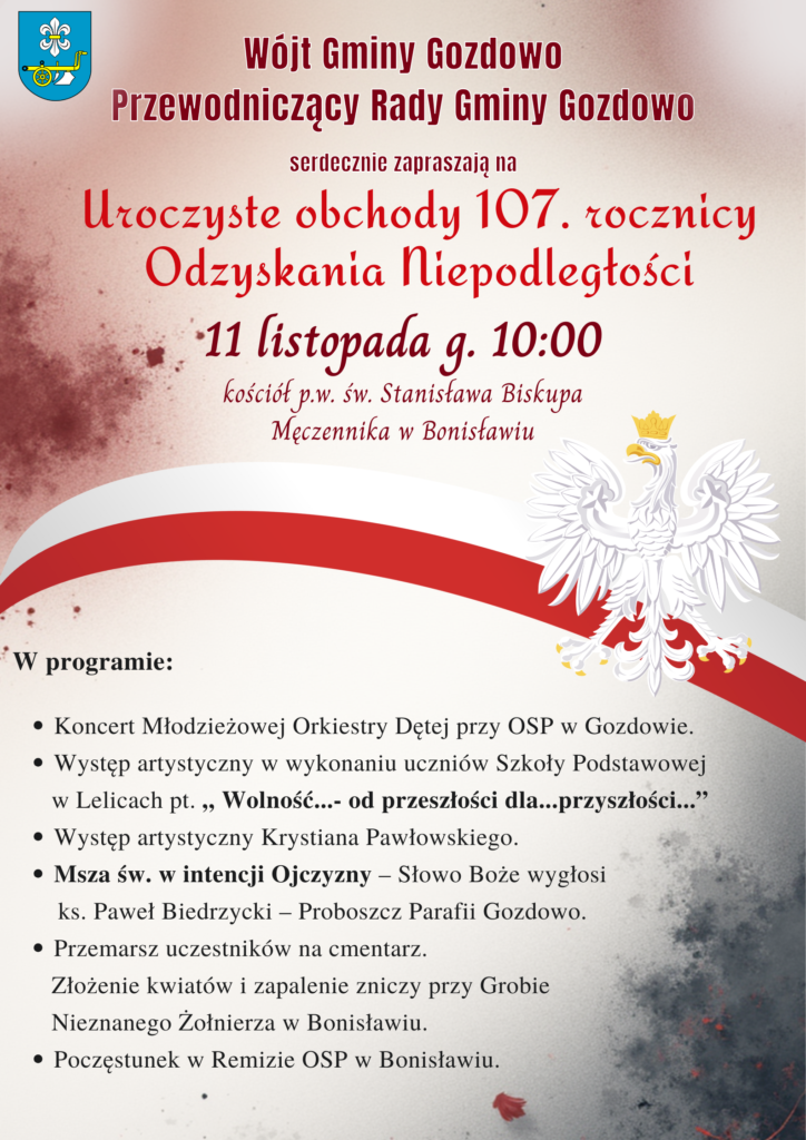 Wójt Gminy Gozdowo Dariusz Kalkowski, Przewodniczący Rady Gminy Dariusz Śmigielski zapraszają mieszkańców, przedstawicieli instytucji i organizacji działających na terenie Gminy Gozdowo do udziału w gminnych obchodach Święta Niepodległości.